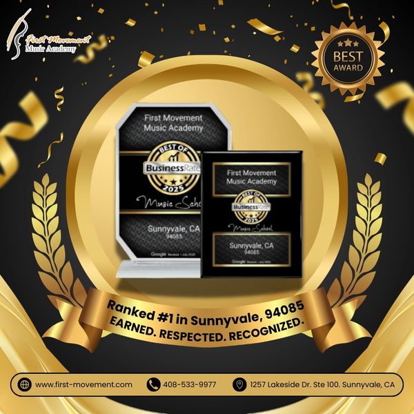 First Movement Music Academy is proud to be recognized as the #1 Music School in Sunnyvale (94085) by BusinessRate, powered by Google Reviews.